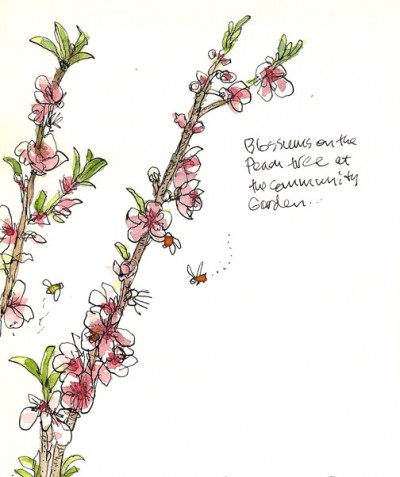 I watered our plot at our Community Garden and, while soaking the roots of a sapling, sketched some of the blossoms of a nearby peach tree. The bees were busy…