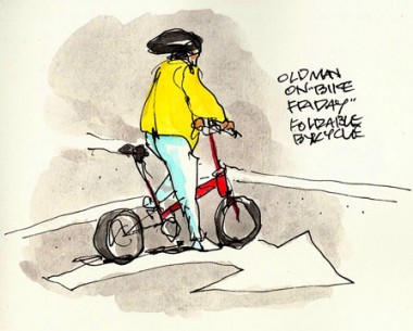Quick sketch here. I was watering the garden and looked up to see an older man, in his 60s I would guess, stopping his bike for the red light. I had just the time for the light to change green to sketch him. I recognized it as a Bike Friday because my current office mate has one parked just outside our office. He has a great animated drawing of it on his blog. The light changed, the man took off, and I resumed watering.