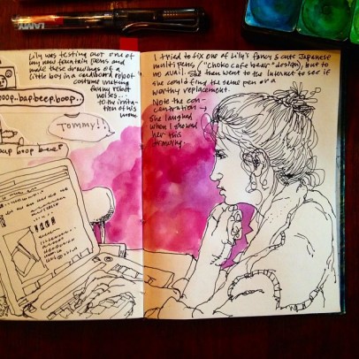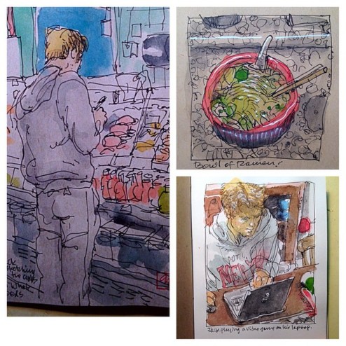 Since Laura Murphy Frankstone challenged me to do three sketches a day for five days, here’s the first: Sketching today with my son at Whole Foods market: he’s drawing stuff in the fish area while I draw him, a bowl of ramen we ate there, him at home playing a video game.
