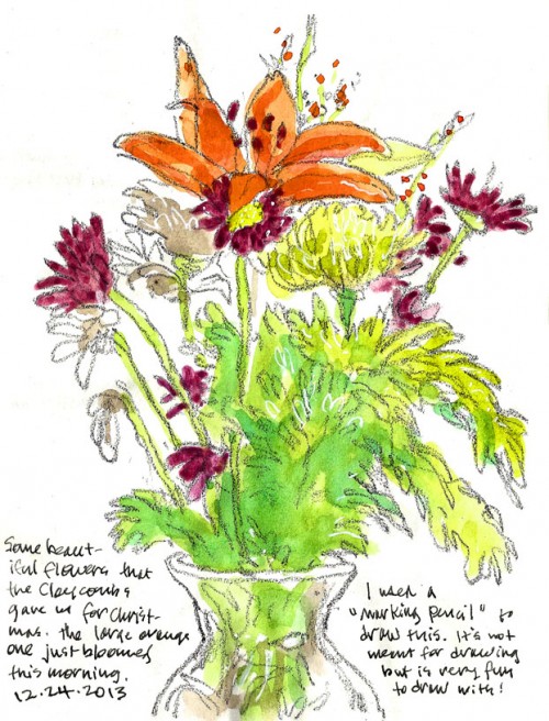 I sketched these flowers this morning after I noticed that one of them bloomed over night. I used a black Listo Marking Pencil – ancient technology for a “marks on anything” kind of grease pencil, sort of the Sharpie from the 1920s. It’s waterproof so it works great with watercolor. Anyway, happy holidays! My new year’s resolution is to post more often 🙂